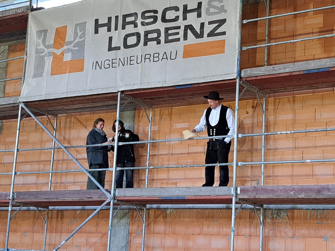 Herr Pritsch und Herr Malz, die Schulleiter der Grund- und Oberschule, dankten in ihrer abwechselnd vorgetragenen Rede besonders allen am Bauvorhaben beteiligten Personen. Herr Krieger, einer der beiden Partner des Architektenbüros "Krieger und Mielke", skizzierte nochmals die Entstehungsgeschichte dieses Bauvorhabens und Frau Groth als Bauleiterin des Erzbistums leitete dann in ihrem Grußwort über zum Richtspruch des Zimmerers bzw. Poliers. Frau Bartelt vom Architekturbüro, Frau Groth und der Zimmermann warfen dann, dem Ritual gehorchend, ihre Sektgläser, mit denen sie zuvor angestoßen hatten, zu Boden. Der Tradition nach sollen die Scherben Glück bringen. Nach dem offiziellen Teil durften sich alle Anwesenden mit einer zünftigen Kartoffelsuppe, Würstchen, Brötchen oder Brezeln stärken und an den Tischen ins Gespräch kommen. Allen Helferinnen und Helfern, die zum Gelingen des Richtfestes beigetragen haben, sei herzlichst gedankt. P. B.