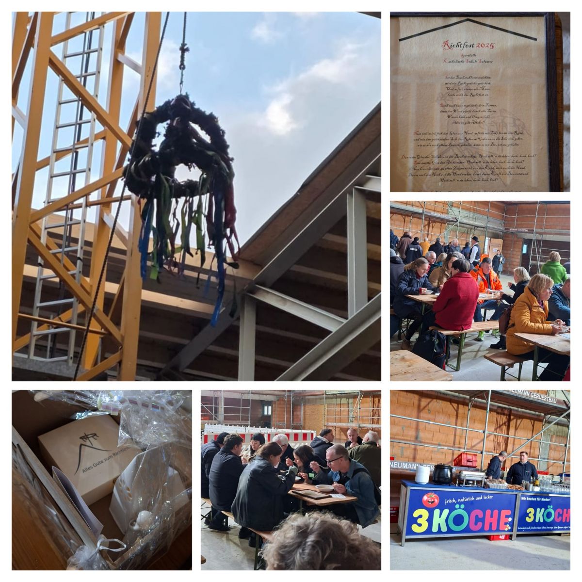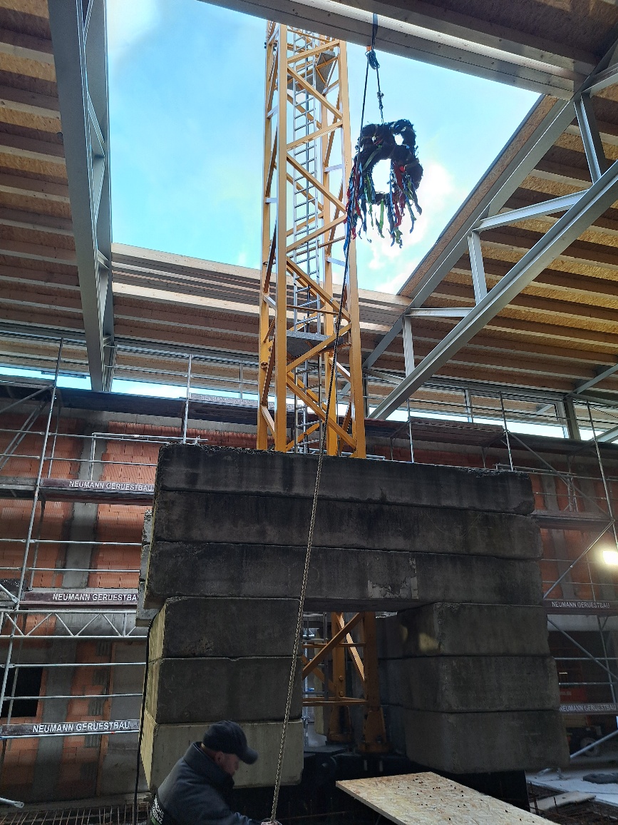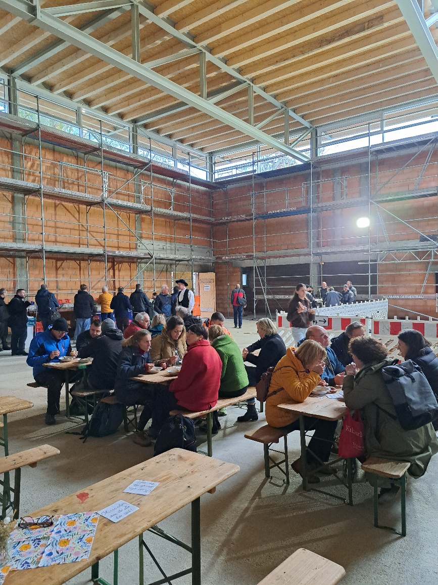 Ein großer Schritt auf dem Weg zur Fertigstellung unserer 2-Feld- Sporthalle war das Richtfest am Nachmittag des 10.11.2025, das im Rohbau des Gebäudes mit rund 80 Gästen gefeiert wurde.
