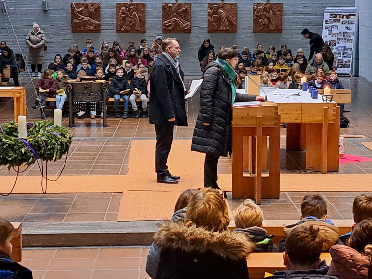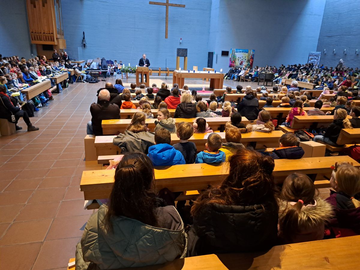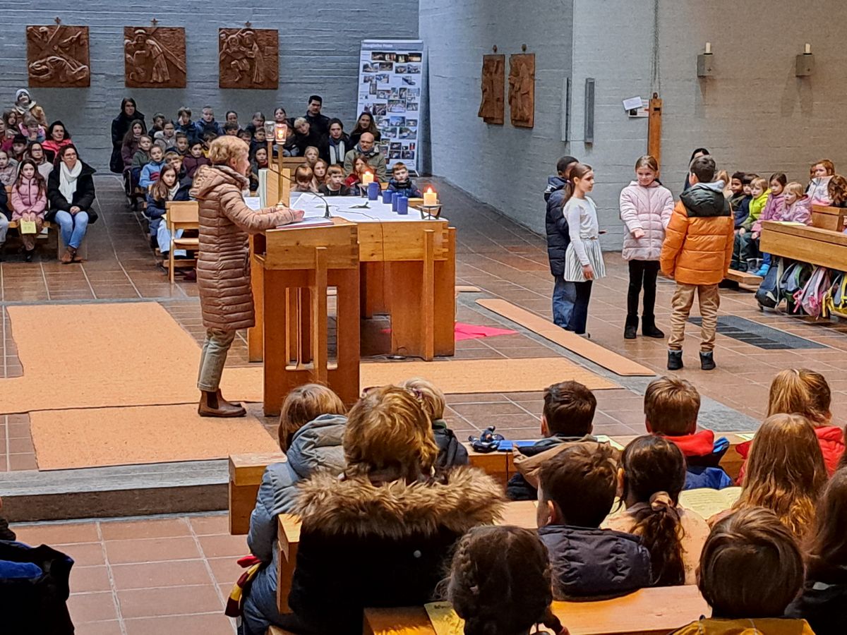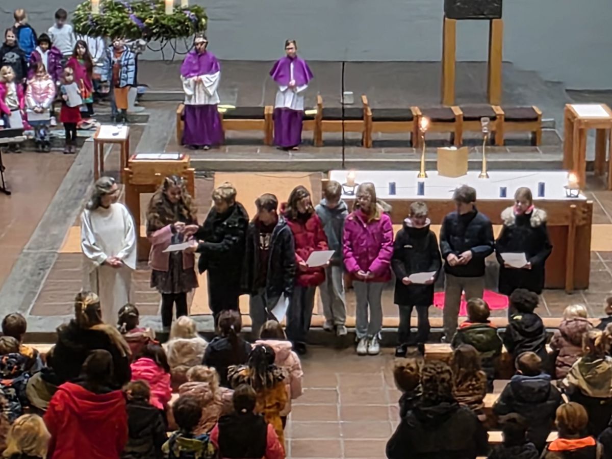Rund 480 Kinder sowie die begleitenden Eltern und Erziehungsberechtigten folgten dem Gottesdienst, den das schulpastorale Vorbereitungsteam unter das Thema „Licht in Dunkelheit“ gestellt hatte. Die Gemeindereferentin Frau Ring leitete durch die Feier und wurde dabei von Schülerinnen und Schülern aus verschiedenen Klassenstufen unterstützt, die Texte vorlasen oder pantomimisch begleiteten. Alle Anwesenden beteten und sangen kräftig mit, wobei die professionelle Instrumentenbegleitung durch Frau Halle, Frau Kaping, Frau Pape und Frau Seilkopf half, den richtigen Ton zu finden. Auch der Chor der 2. und 3. Klassen unter Leitung von Frau Kaping kam zum Zuge. Allen an diesem Gottesdienst Mitwirkenden sei herzlich gedankt, insbesondere dem Kollegium der Filiale für die logistische Vorbereitung. P. B.