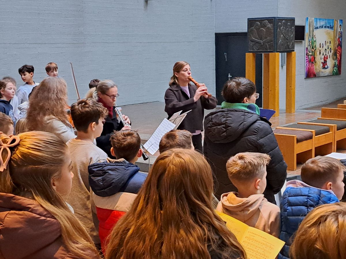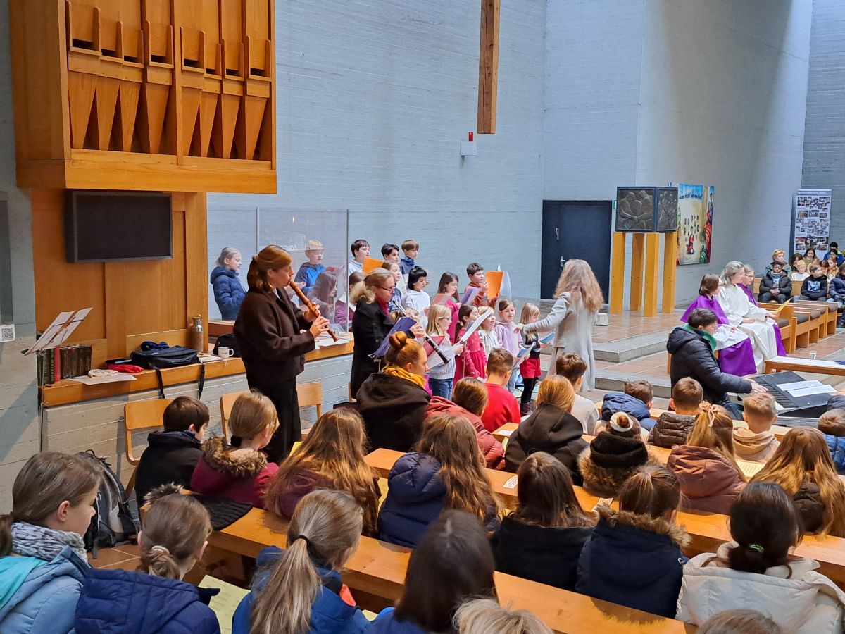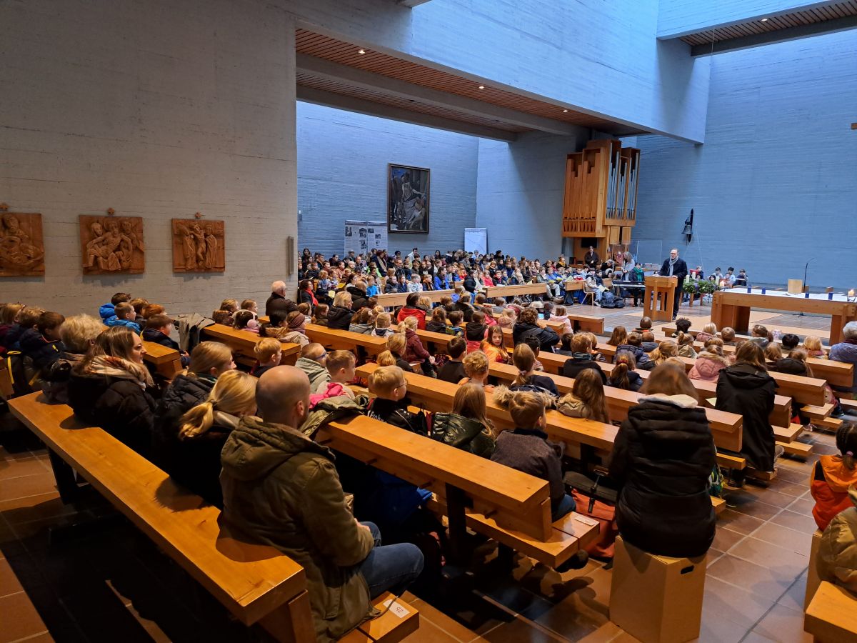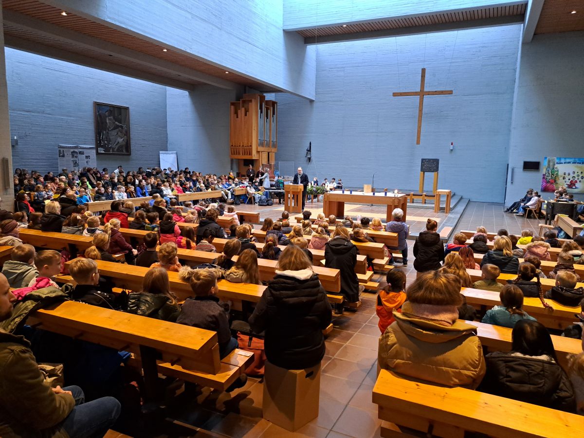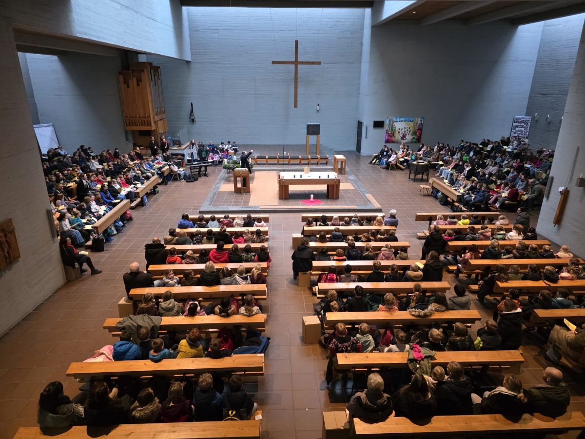 Rund 480 Kinder sowie die begleitenden Eltern und Erziehungsberechtigten folgten dem Gottesdienst, den das schulpastorale Vorbereitungsteam unter das Thema „Licht in Dunkelheit“ gestellt hatte. Die Gemeindereferentin Frau Ring leitete durch die Feier und wurde dabei von Schülerinnen und Schülern aus verschiedenen Klassenstufen unterstützt, die Texte vorlasen oder pantomimisch begleiteten. Alle Anwesenden beteten und sangen kräftig mit, wobei die professionelle Instrumentenbegleitung durch Frau Halle, Frau Kaping, Frau Pape und Frau Seilkopf half, den richtigen Ton zu finden. Auch der Chor der 2. und 3. Klassen unter Leitung von Frau Kaping kam zum Zuge. Allen an diesem Gottesdienst Mitwirkenden sei herzlich gedankt, insbesondere dem Kollegium der Filiale für die logistische Vorbereitung. P. B.