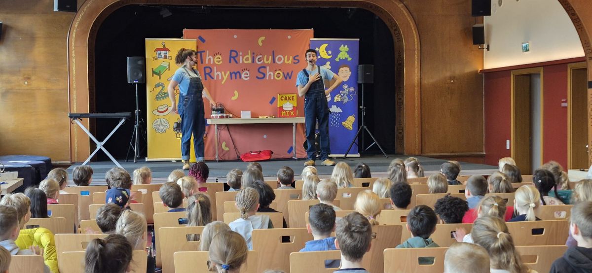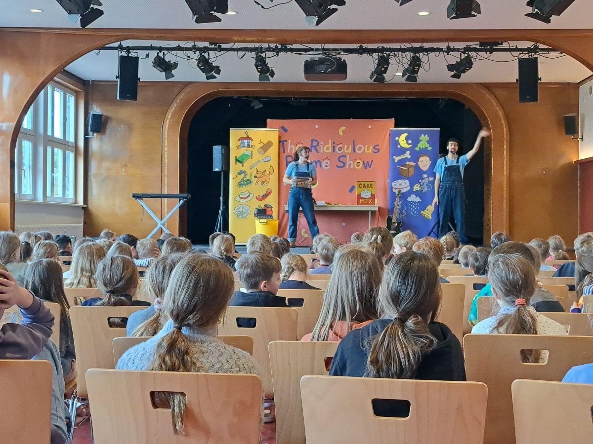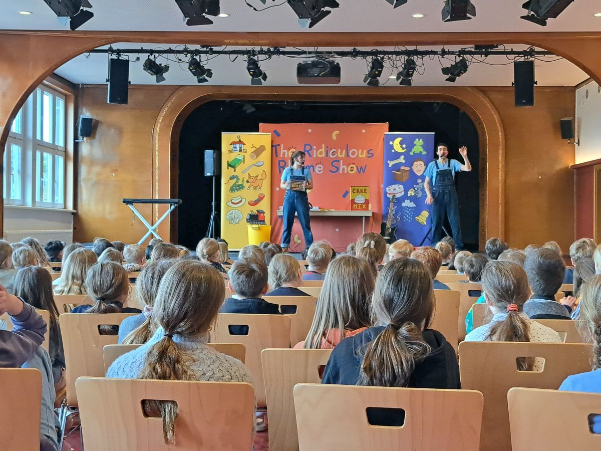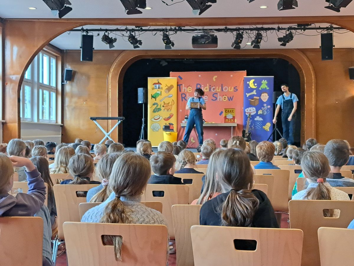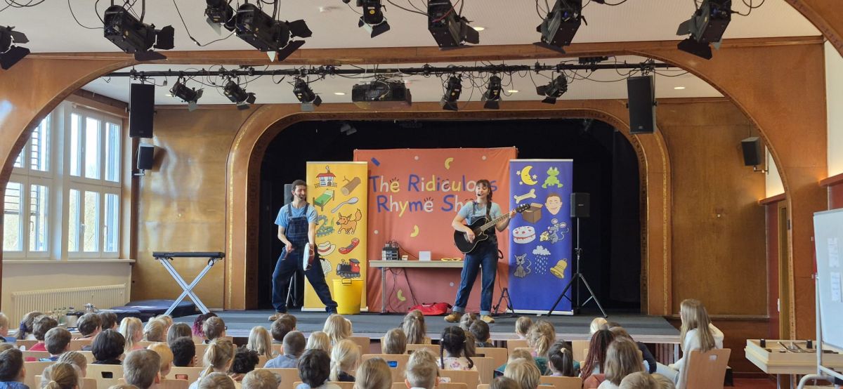 Am Freitag, 20.3. besuchte uns die „Ridiculous Rhyme Show“ aus Großbritannien, deren Ziel es ist, Grundschulkindern durch Musik und Comedy die Lust am Englischlernen zu vermitteln.